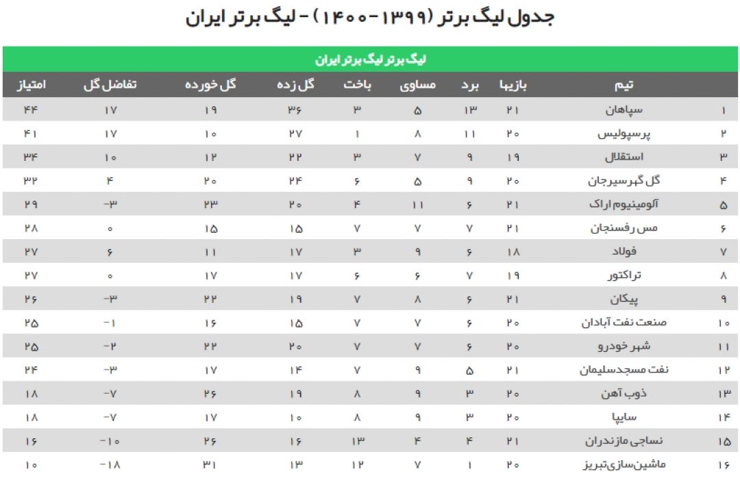 جدول لیگ برتر فوتبال در هفته بیست و سوم رقابتهای لیگ برتر فوتبال باشگاهی كشور سپاهان مقابل مس رفسنجان به پیروزی پرگل دست یافت و صدر را از پرسپولیس گرفت. 4 سال پیش