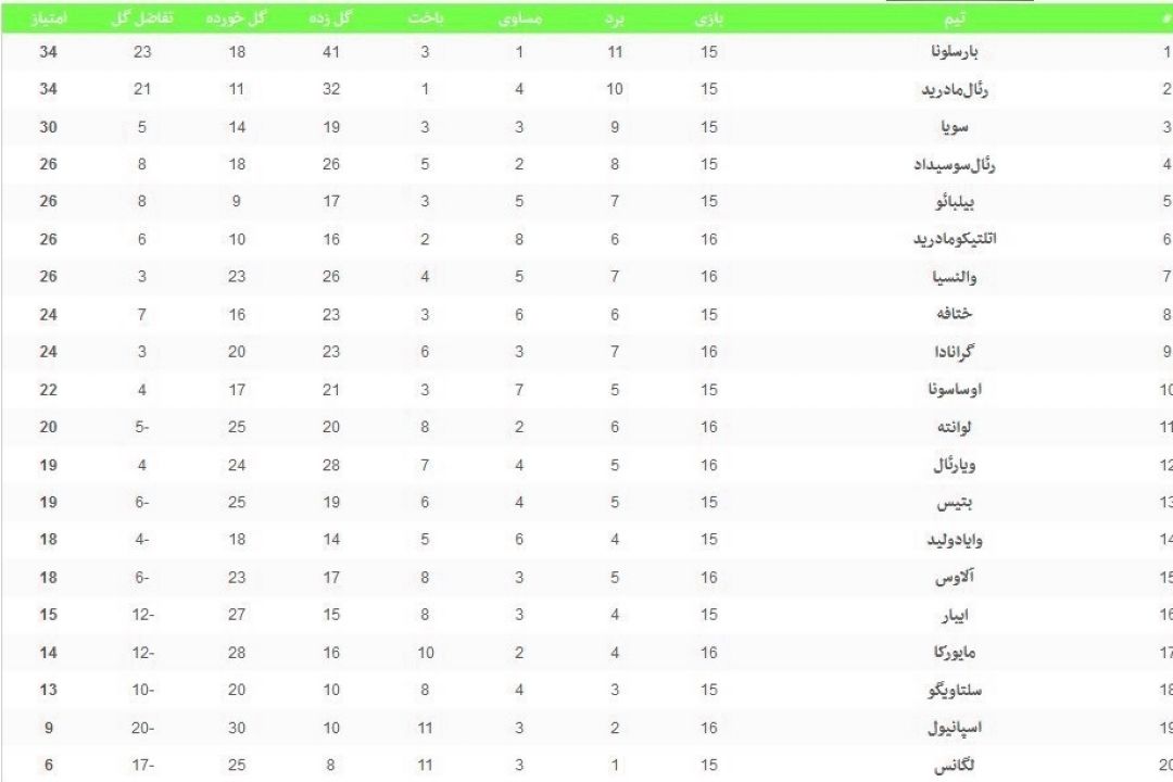 جدول ردهبندی لالیگا در پایان شب دوم از هفته شانزدهم ادامه تعقیب و گریز رقبای دیرینه در صدر جدول رقابتهای لالیگا 6 سال پیش